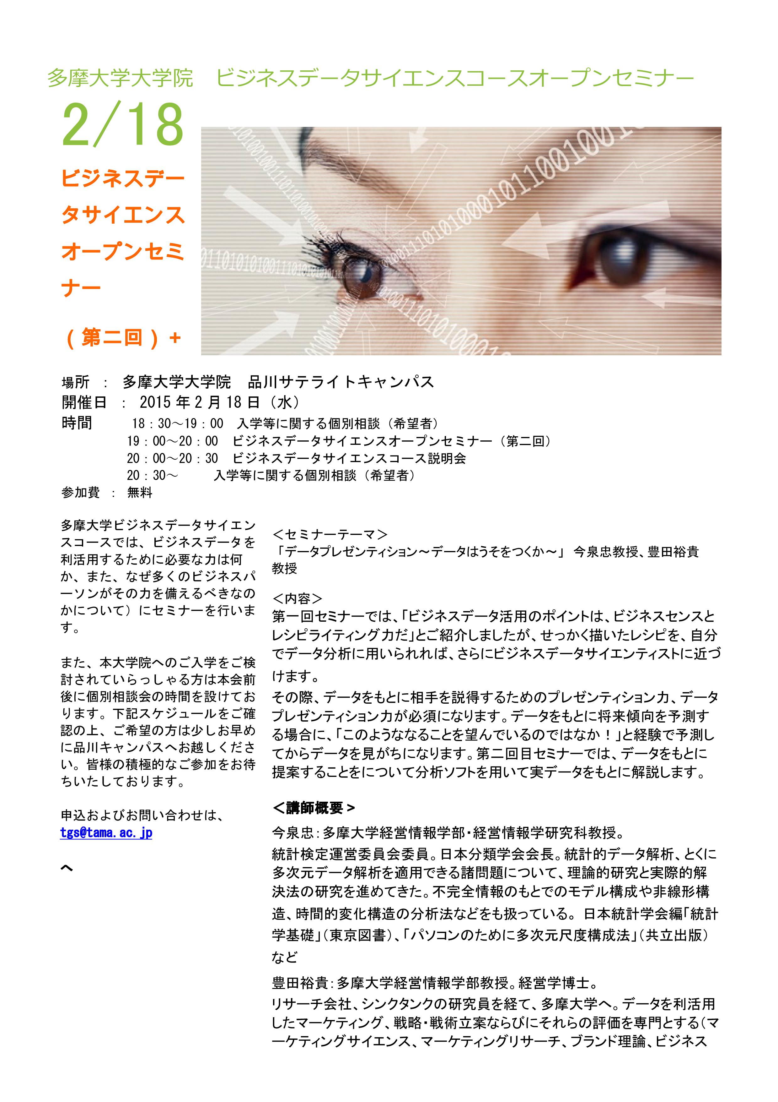 多摩大学大学院ビジネスデータサイエンスコース(DSBコース)から「オープンセミナー」の開催のご案内です。