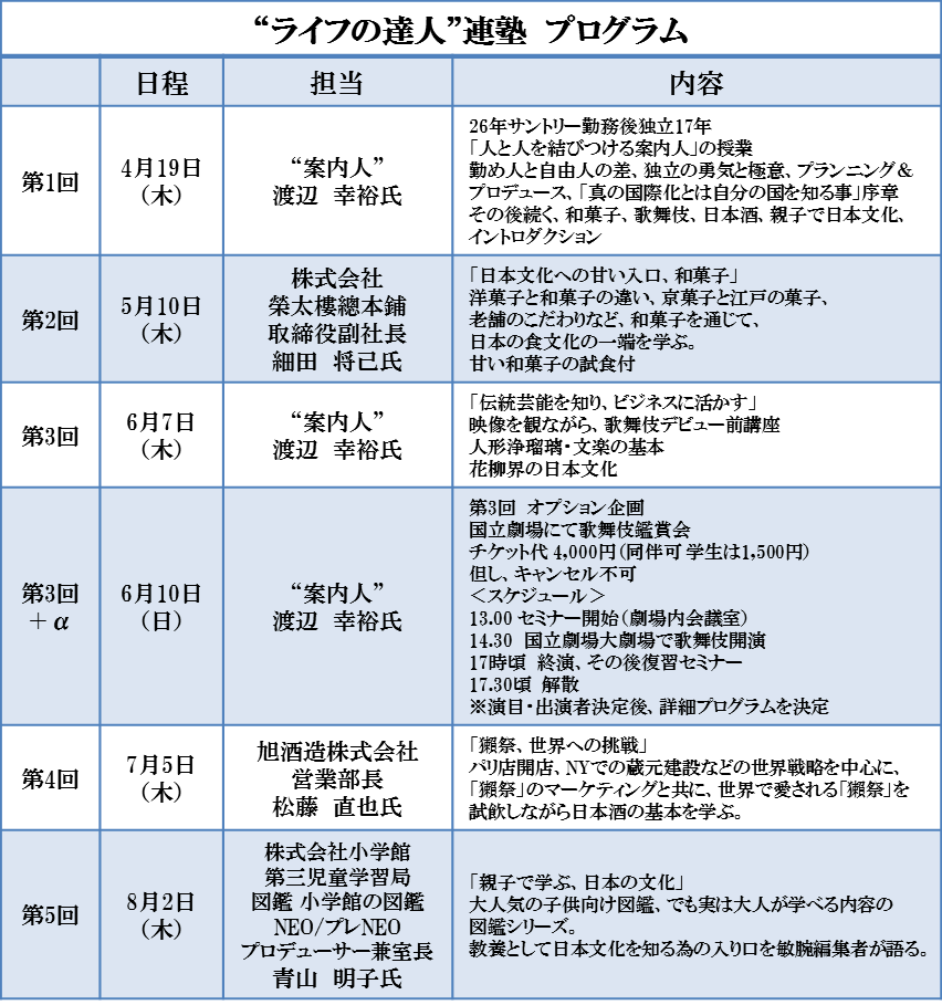 今回、サントリーで長く宣伝部門で活躍され、49歳で独立、“人と人を結びつける公私融合の自由人”として活躍している渡辺幸裕さんを“案内人”としてお呼びし、各界の人生の達人にその知恵、技、経験などを直にお聞きするという機会を設けました。