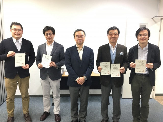 写真は左から、久保田 貴文 准教授、亀井 省吾 客員教授、徳岡 晃一郎 研究科長、佐藤 勝彦 特任教授、栗山 実 客員教授